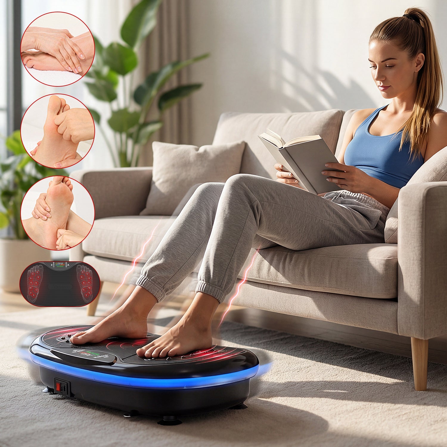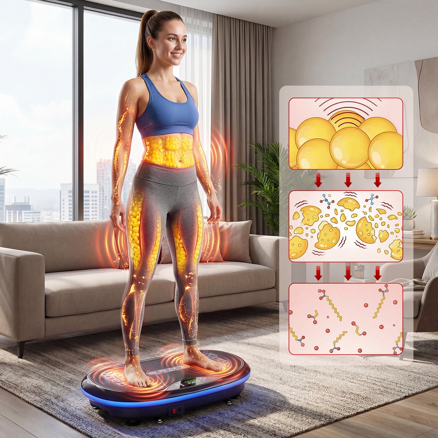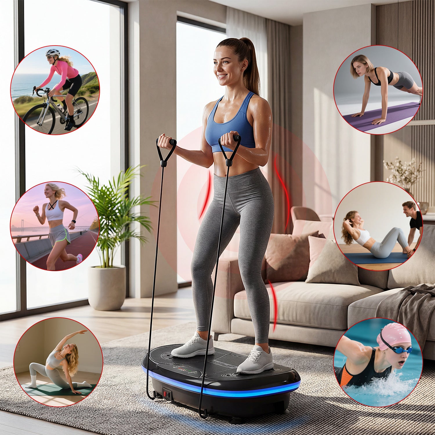 Just 10 minutes on the JV80 vibration plate can match the calorie burn of ≈1 hour of cycling, ≈100 push-ups, ≈1 hour of jogging, ≈100 sit-ups, ≈1 hour of yoga, or ≈30 minutes of swimming—saving time while maximizing results.