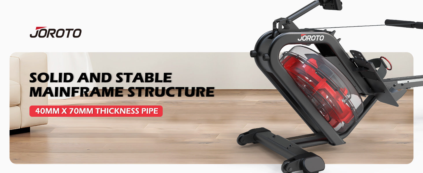 JOROTO MR26 rower machine Built with high-quality materials and thick tubing, this rowing machine ensures exceptional durability and stability. It can support a maximum weight capacity of 330lb/150kg, making it suitable for a wide range of users. Additionally, its robust structure ensures that it remains stable even during vigorous workouts, providing a safe and secure exercise experience.