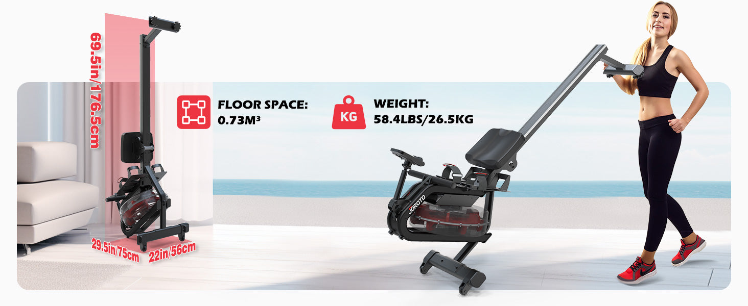JOROTO MR26 rowing machine designed with built-in wheels that make it easy to move and store. When not in use, it can be folded and occupies only 0.73m³ of space, allowing you to maximize your living area.