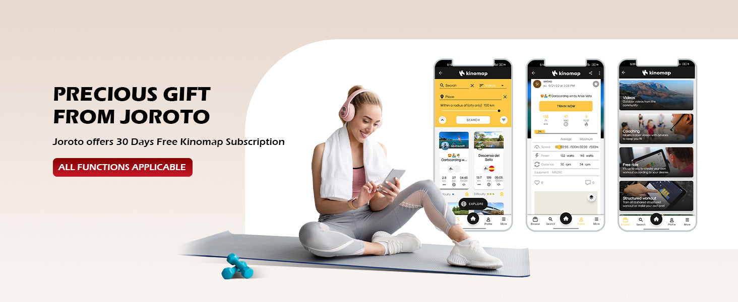 - Extended Kinomap Subscription for Interactive Workouts: Enjoy a 30-day extended Kinomap subscription, adding to your standard 14-day trial for a total of 44 days of full access to engaging courses and expert-led workouts. Simply contact JOROTO after your purchase for your activation code.